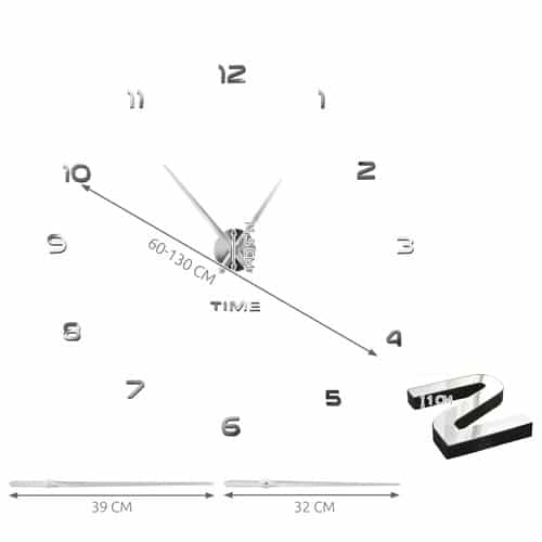 DIY NÁSTENNÉ HODINY – vytvorte si hodiny podľa vlastnej predstavy a prilepte ich na stenu. Hodiny majú krásny a moderný vzhľad a sú vyrobené z materiálu s efektom zrkadla. Číslice sa pripevňujú pomocou priloženej samolepiacej pásky. Hodiny sa hodia ku všetkým farbám stien. Najlepšie vyzerajú s priemerom 60 až 130 cm, ale môžete ich prilepiť aj s ľubovoľným iným priemerom. Číslice možno usporiadať klasicky okolo alebo vytvoriť neobvyklú kompozíciu podľa vlastného vkusu – všetko závisí len od vás!