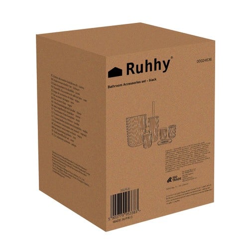 Tento elegantný a odolný 6-dielny kúpeľňový set v modernom čiernom prevedení s ryhovaným dizajnom a bambusovými detailmi je dokonalou kombináciou estetiky a funkčnosti. Vyrobený z kvalitného PP plastu v kombinácii s prírodným bambusom, prináša do kúpeľne nielen štýl, ale aj praktické riešenia.