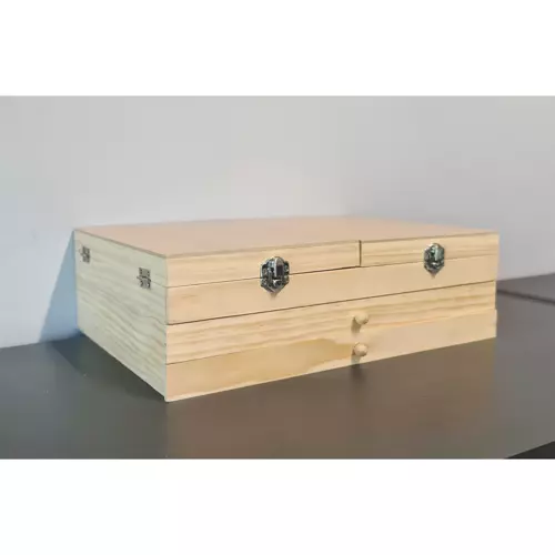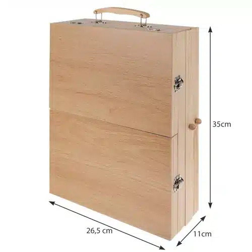 Kufrík je vyrobený z kvalitného dreva, má zámok a pohodlnú rukoväť, vďaka čomu sa ľahko prenáša a bezpečne skladá všetky umelcovské potreby. Vo vnútri sú dve zásuvky a všetky nástroje majú svoje miesto v špeciálnych priehradkách, aby ste ich rýchlo našli a udržali poriadok.