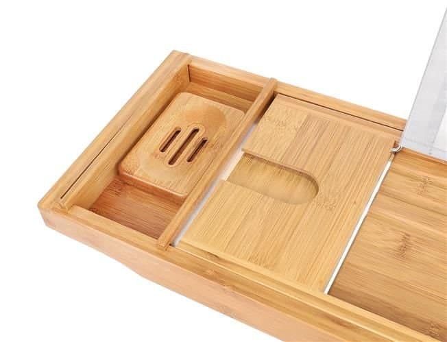 Vychutnajte si relax vo vani s touto funkčnou a elegantnou bambusovou poličkou, ktorá poskytuje priestor pre všetko potrebné počas kúpeľa. Polica je vybavená držiakom na tablet alebo knihu (s tromi uhlami nastavenia), držiakom na pohár vína, vyberateľnou vložkou na uterák, držiakom na mydlo, miestom na telefón a priehradkou na sviečku.