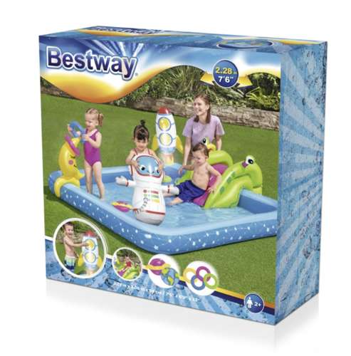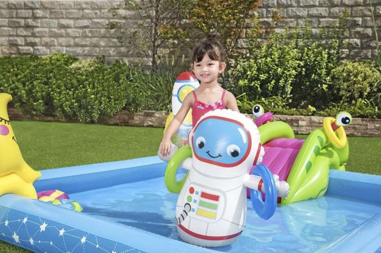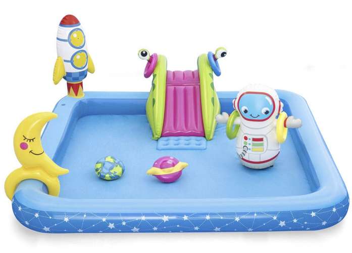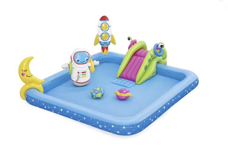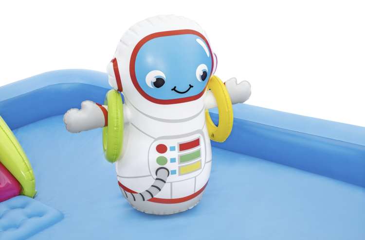 Bazén je vybavený raketou, kozmonautom, planétami, Mesiacom a šmýkačkou, ktorá vedie priamo do vody. Súčasťou sady sú aj hádzacie kruhy, ktoré môžu deti triafať na Mesiac – ideálna aktivita na rozvoj koordinácie a sústredenia.