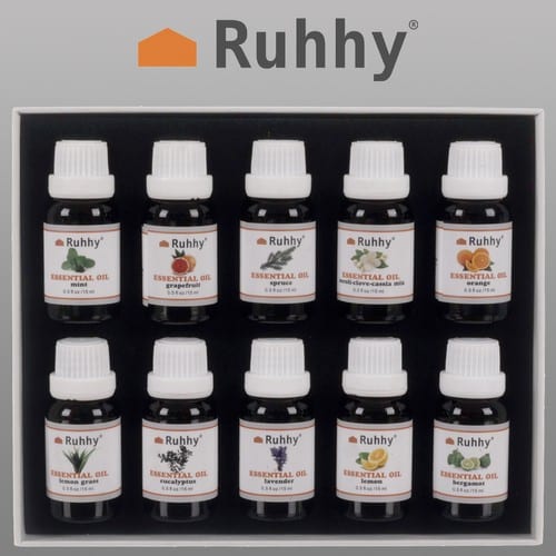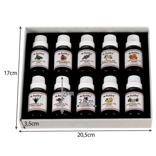 10 rôznych vôní – V balení nájdete až 10 jedinečných vôní: eukalyptus, pomaranč, mäta, levanduľa, borovica, citrón, lekno, grep, citrónová tráva a bergamot. Oleje sú uzavreté v praktických sklenených fľaštičkách po 15 ml.
