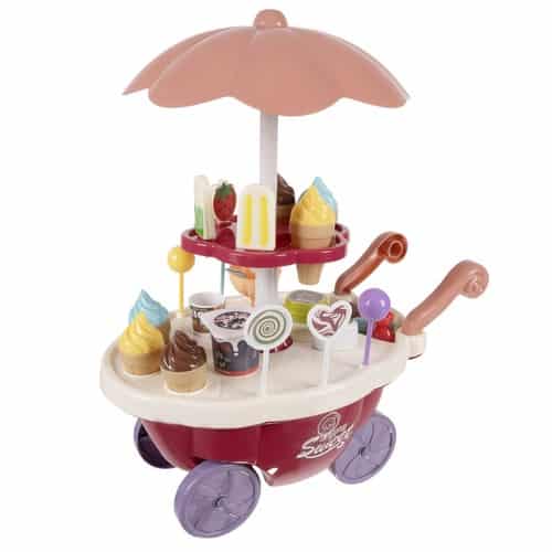 • Realistický dizajn – Vozík má otočné kolieska, predajný pultík a bohatú výbavu zmrzlín, lízaniek, sušienok a nápojov.