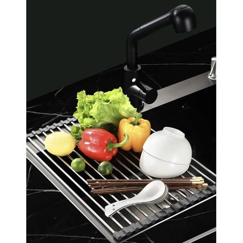 Udržujte kuchynskú linku čistú a upratanú s touto praktickou odkvapkávačnou mriežkou! Rolovateľný odkvapkávač umožňuje jednoduché sušenie riadu priamo nad drezom, čím zabraňuje stekaniu vody na pracovnú dosku. Okrem riadu je ideálny aj na umývanie a odkvapkávanie ovocia a zeleniny.