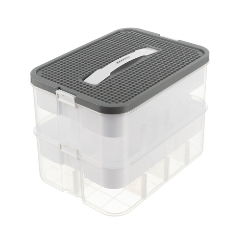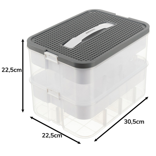 Dve priehľadné úrovne poskytujú okamžitý prehľad o obsahu a praktická rukoväť umožňuje jednoduché prenášanie – ideálne do detskej izby, škôlky alebo aj na cestovanie.