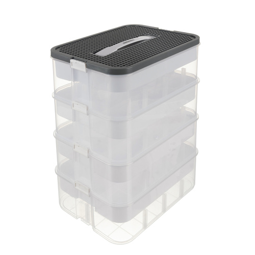 Tri priehľadné poschodia je možné používať samostatne alebo ukladať na seba. Silné uzatváracie klipsy zabezpečia stabilitu aj pri prenášaní alebo počas hrania. Každá úroveň je vybavená modulárnymi prepážkami, takže si môžete jednoducho vytvoriť vlastný systém triedenia – podľa farby, veľkosti alebo typu hračiek.