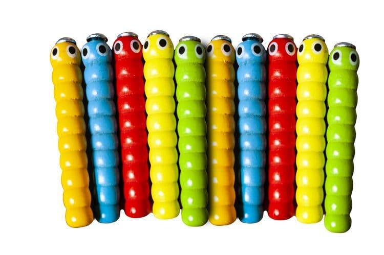 Každý z 10 drevených červíkov má inú farbu, takže sa dieťa učí identifikovať farby a porebovanie tvarov. -