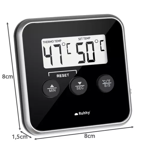 S digitálnym kuchynským teplomerom Ruhhy bude kontrola teploty jednoduchá a presná! Veľký LCD displej umožňuje ľahké čítanie hodnôt a teplomer je vybavený magnetom, takže ho môžete pripevniť na kovové povrchy – ako chladnička, gril alebo rúra.