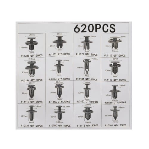 ✔️ Odolné a univerzálne klipsy – Sada obsahuje 620 klipsov v 16 rôznych typoch, vhodných na široké použitie v aute, napríklad na upevnenie čalúnenia, kapoty, nárazníkov, bočných výstuh a ďalších dielov.