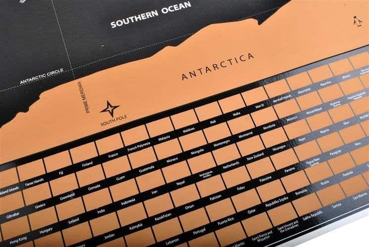 Táto mapa funguje ako odierací žreb: povrch krajín je pokrytý zlatou fóliou, ktorú môžeš jednoducho odtierať po návšteve danej krajiny. Po odtieraní sa objavia farebné detaily a zaujímavosti, ktoré vizuálne zdokumentujú tvoje cestovateľské zážitky.