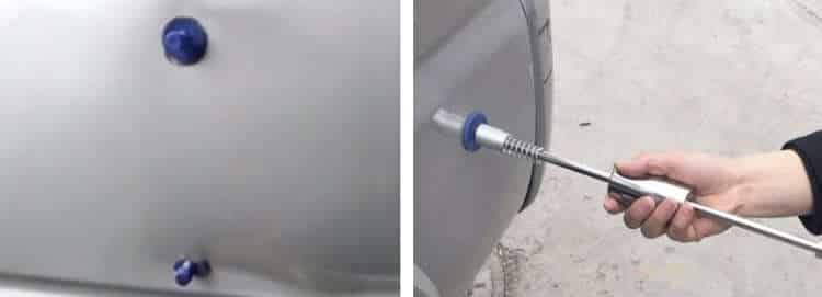 Vyberte si z 18 rôznych veľkostí a tvarov lepiacich podložiek, naneste na ne lepidlo a prilepte na preliačinu. Po vychladnutí lepidla viackrát jemne potiahnite posuvným kladivom – preliačina sa postupne vyrovná, bez toho aby došlo k poškodeniu povrchu.