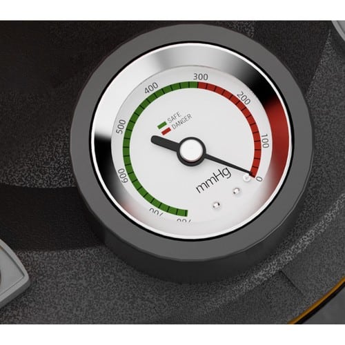 Integrovaný manometer zobrazuje aktuálnu úroveň podtlaku. Keď sa ručička nachádza v zelenej zóne, je spojenie pevné a bezpečné na zdvíhanie. -