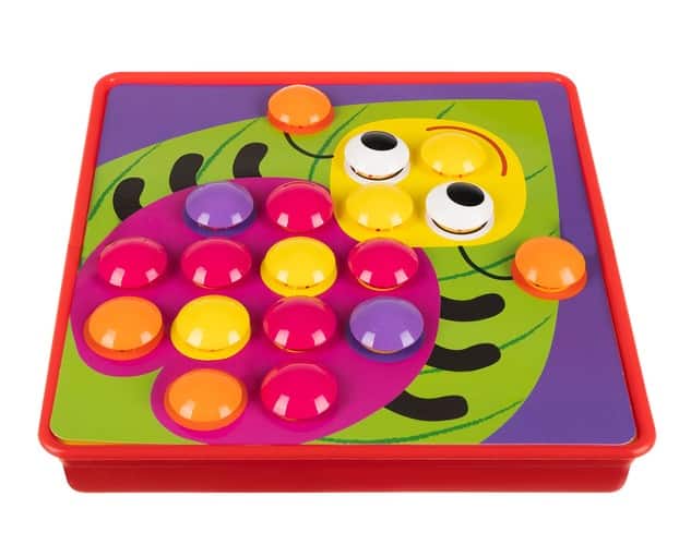 Farebná a kreatívna hra – 45 gombíkov v 6 výrazných farbách (biela, žltá, oranžová, ružová, fialová, modrá a zelená) umožňuje tvoriť pestré obrázky a vzory.