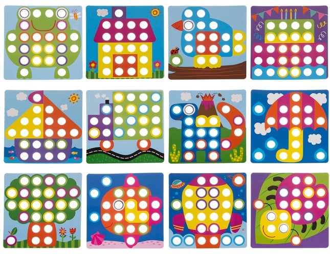 Farebná mozaiková skladačka pre deti – 45 gombíkov, 12 obrázkových kariet